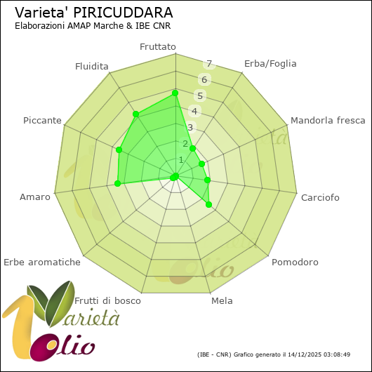 I dati della varietà PIRICUDDARA si riferiscono alle annate di seguito riportate (tra parentesi tonda il numero di campioni per singolo anno): [2025 (1)] .Profilo sensoriale medio