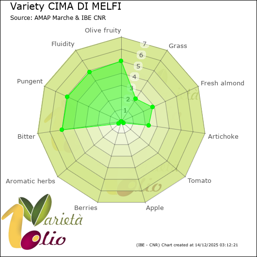Data of variety CIMA DI MELFI are related to years (in brackets the number of samples in each year): [2006 (1)] [2007 (2)] [2008 (1)] [2015 (1)] [2016 (1)] [2017 (1)] [2018 (2)] [2021 (1)] [2022 (2)] [2023 (1)] [2024 (3)] [2025 (3)] .